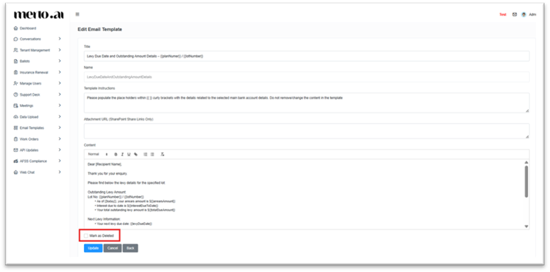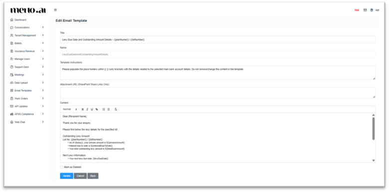 - Template Usage: To be used for responding to customer enquiries related to levy due dates, outstanding balances, arrears, and payment details.